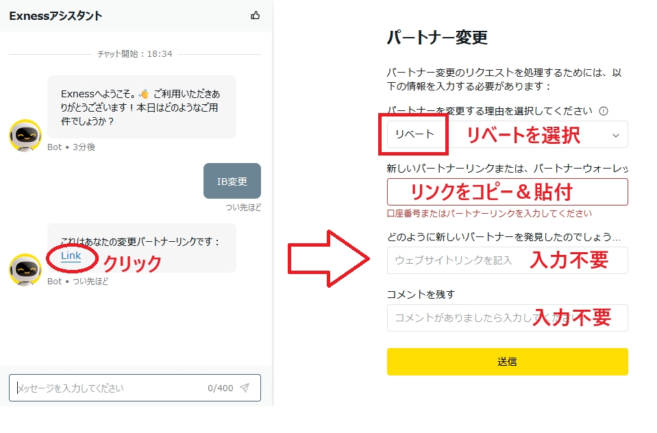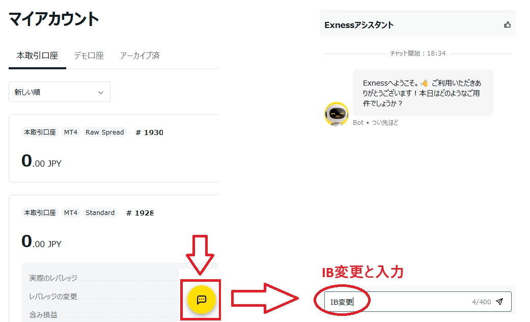 ②メッセージ欄で「IB変更」と入力